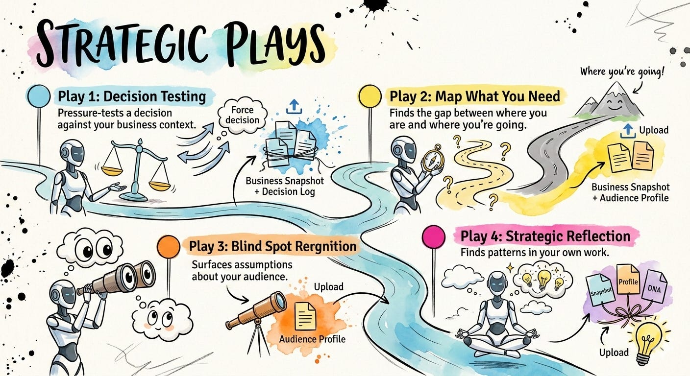 Play 4: Strategic Reflection. Run it at the end of a month or a project cycle. It finds the patterns in your own work before you build more: what’s emerging, what’s stalling, what question you should actually be sitting with. Why it matters: this play does the most work with the full five docs loaded. Patterns that look like business problems often turn out to be operating problems, and that only surfaces when Personal Context is in the room. Upload: all three docs. Add Personal Context and Product/Offer Context when you have them.
