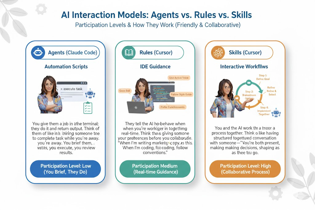 Automation and collaboration are different execution models. Agents automate (you brief, they execute, you review). Rules guide (the AI adapts to you in real time). Skills collaborate (you work through it together, step by step). Same AI, different levels of participation.
