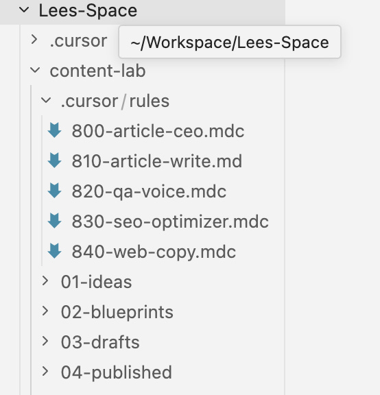 Inside Lees-Space, I created another separation: a content-lab subfolder for editorial work and a marketing-assets subfolder for conversion copy. Each has its own rules folder, so the AI loads the right context for the right job.