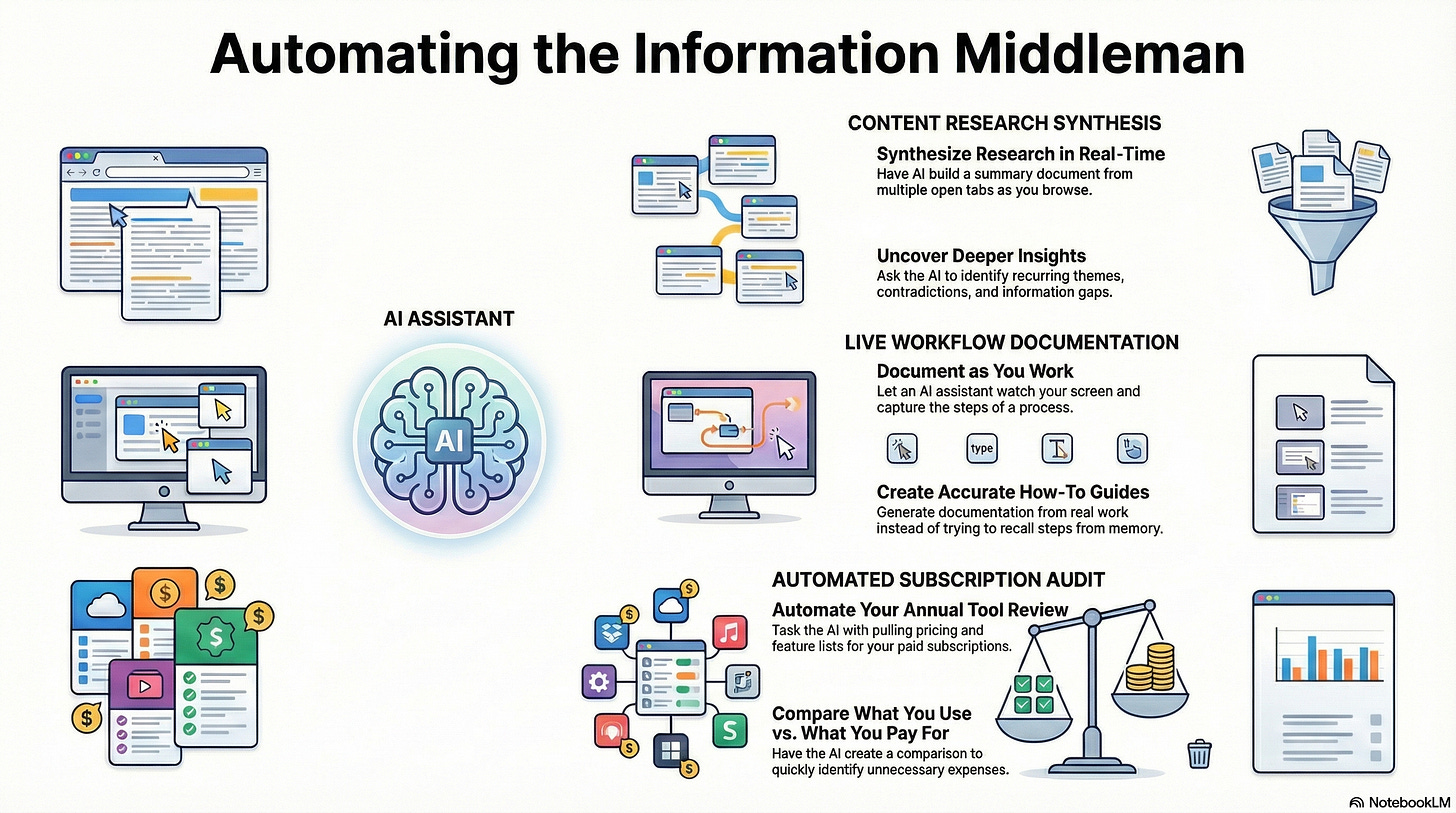 Your existing tools first. Before adding anything new, check what you already have. ChatGPT has a browser feature. So does Perplexity. If you’re paying for something with browser capability, test the edges of what it can do before subscribing to something else.