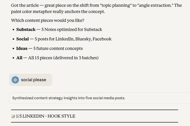 The artifact worked well enough that I turned it into a full Claude project. Now I have a system that gives me purposeful items to share without having to start from scratch every time.