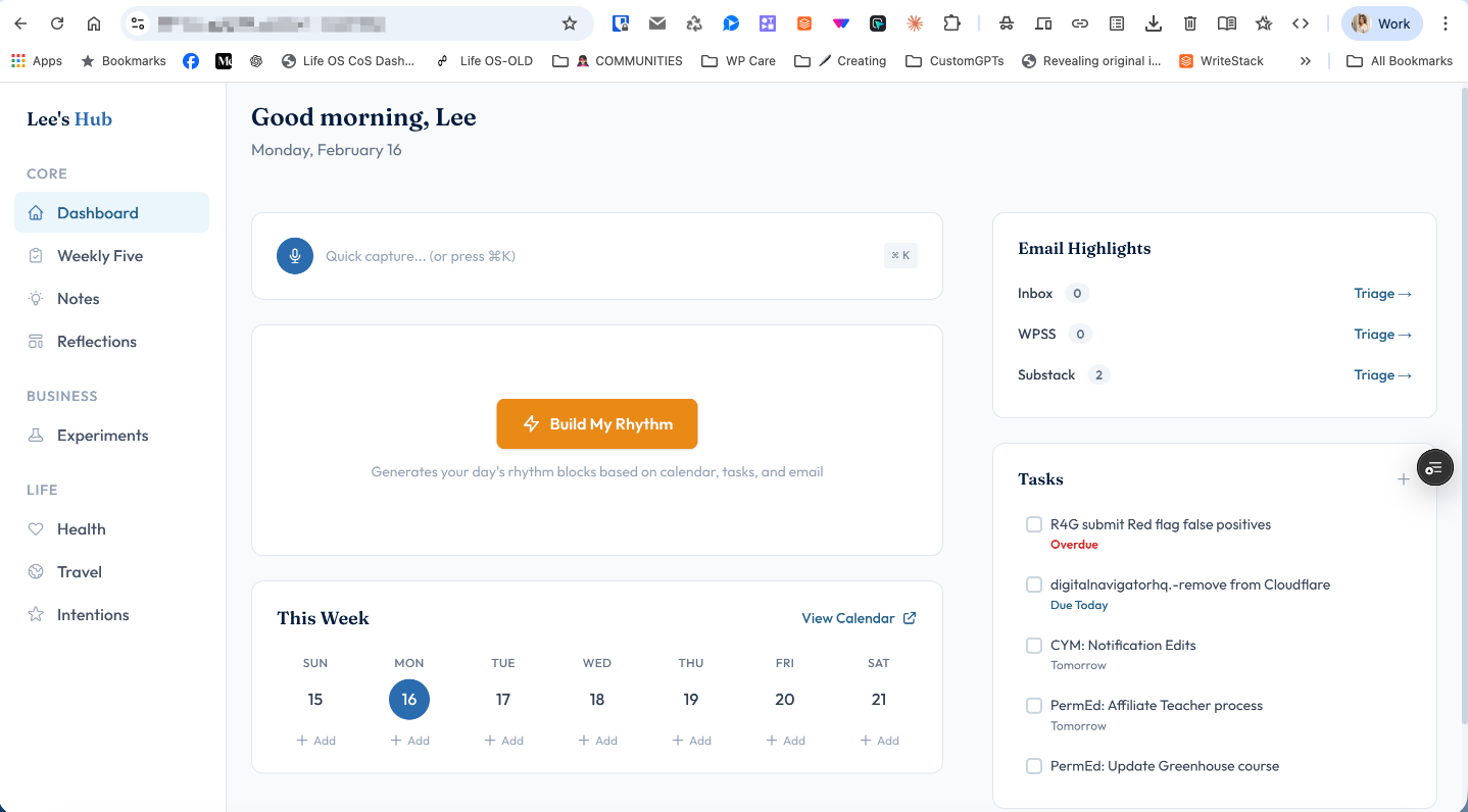 My dashboard pulls from two email accounts, Google Tasks, Google Calendar, Google Drive and soon Notion. It generates rhythm blocks based on my energy, my priorities, and my commitments. Yours won’t look anything like that. It shouldn’t.
