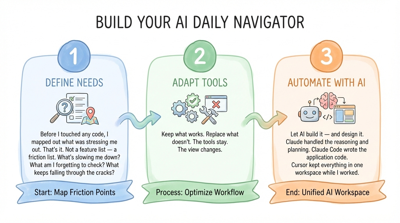 Here’s what it actually took: a code editor, a hosting platform, and API access. That’s the infrastructure. The thinking is the part only you can do. What do I need? What’s already working? What should the day look like?