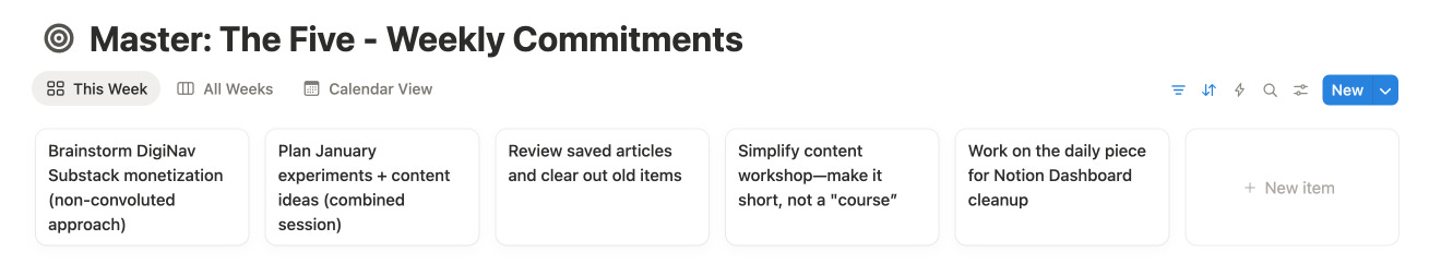 The Weekly 5 writes to a Notion database. That’s the whole point... tracking what I commit to, what I complete, what sits in limbo.