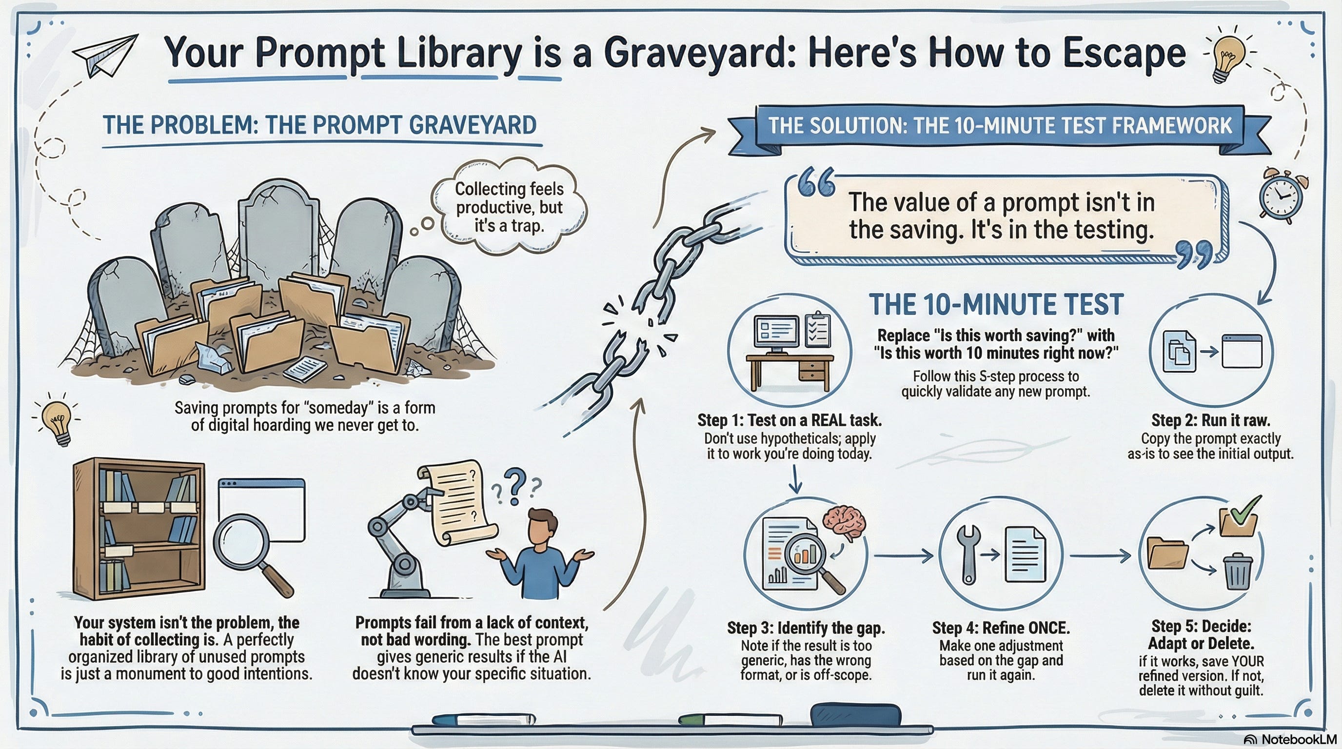 That’s when it hit me: the prompt that works is the one you test today. The one you save for someday? That’s just a different kind of hoarding.